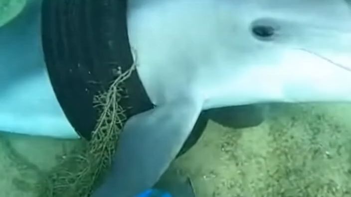 A dolphin was found trapped underwater with a car tire stuck around its neck and fishing nets wrapped around its body.