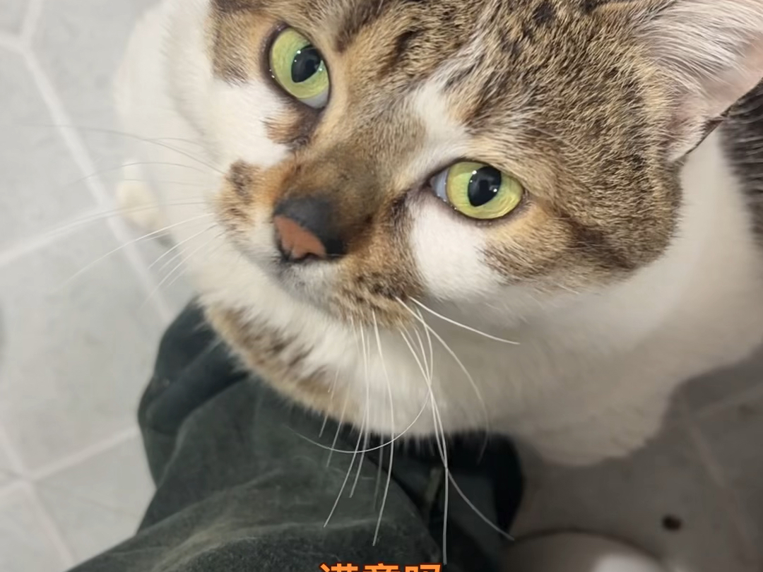 แมวสามสีตัวหนึ่งลุกขึ้นยืนเพื่อให้คนมาลูบตัว