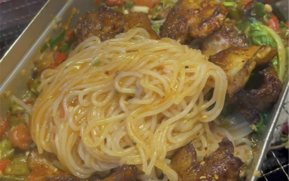 อิ่มเต็มอิ่มกลางแจ้ง: แซลมอนย่าง + ข้าวหน้าปลาอิวาชิ + สปาเกตตีซอสดำ + เนื้อย่างเสียบไม้