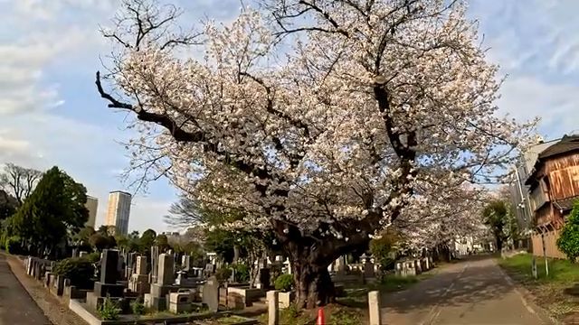 The cemetery is known for its beautiful sakura, and during this time of year, the paths are lined with blooming cherry trees that create a calm and reflective atmosphere.