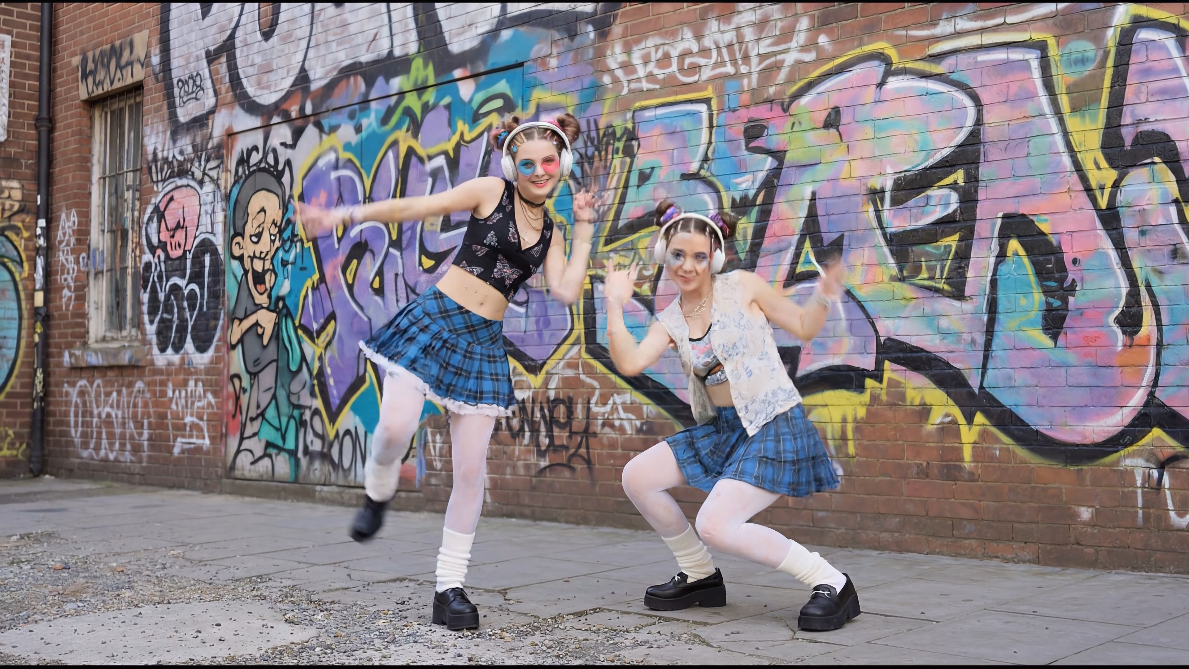 Olivia walked down the street with headphones on, the beat pounding in her chest like a second heartbeat. She stopped by the old gray wall—the same one she and her best friend Amelia had once covered in graffiti. She hit play on her favorite song and started shuffling—slowly at first, testing if her legs still remembered. The light blue plaid skirt fluttered with every quick step, black platform shoes thudded rhythmically against the asphalt, and the white fishnet tights shimmered in the late afternoon light. The street was almost empty—just her and the music. Suddenly her best friend Amelia stepped out from the side alley. Exactly the same light blue plaid skirts, almost identical crop tops, the same black platform shoes, the same white fishnet tights. Hair in matching high ponytails with rainbow clips, headphones on. They froze for a second. Looked at each other. Broke into wide grins, no words needed. Amelia walked over, stood right beside her and instantly locked into the same rhythm. Four legs moved in perfect sync—side step, hop, shuffle, spin. Sometimes mirroring each other, sometimes side by side, sometimes in tandem. Skirts flew, platforms banged, laughter mixed with the bass. On the final drop they both jumped high, hung in the air for a split second, then landed with a loud, joyful laugh. The music faded. They stood there panting, hands on knees. “Still the same beat in our heads,” Amelia said. Olivia just nodded and fixed her ponytail. Then they walked off down the street, shoulder to shoulder—their footsteps still sounding like a dance. All my recordings and links to music on other portals on the website: www.Biel.Style