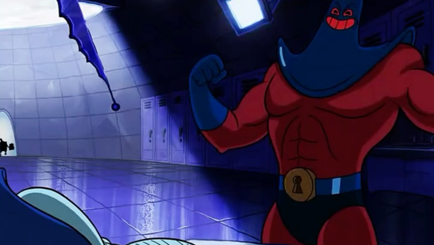 ชายอ้วนสีฟ้าติดสติ๊กเกอร์เวลาสามเท่าบนมือของโนบิตะ