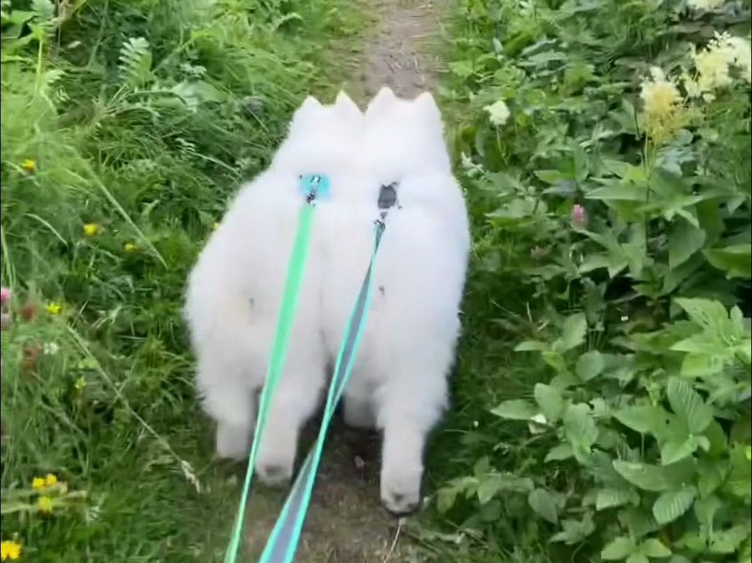 โดยไม่คาดคิด ตอนที่ฉันพาสุนัขเดินเล่น ฉันได้พบกับสุนัขเลียจริงๆ~ และถูกซามอยด์จูบอย่างแรง...