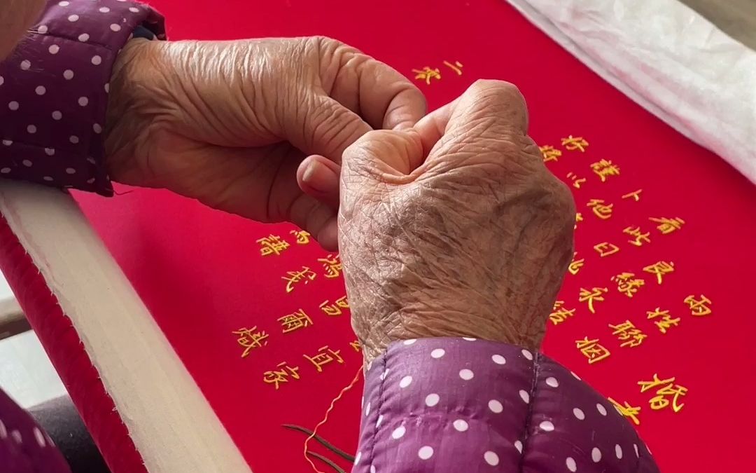 ใช้เข็มและด้ายปัก "แม่น้ำและภูเขาพันไมล์" ซึ่งเป็นหนึ่งในสิบภาพวาดที่มีชื่อเสียงที่สุดของจีนที่สืบทอ