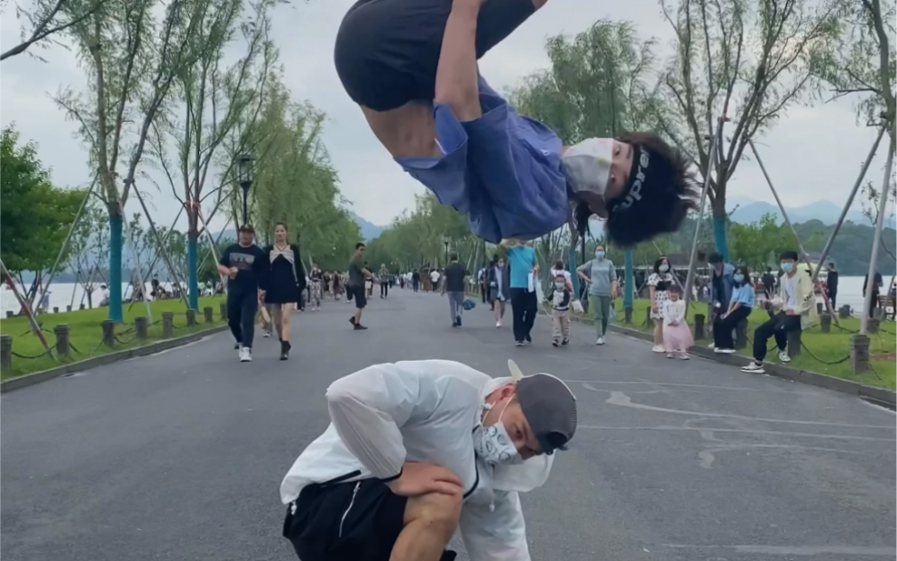 ชายหนุ่มปลอมตัวเป็นหญิงชราแล้วทำท่าตีลังกาหลัง ทำให้ชายชราและหญิงชราที่อยู่ข้างๆ ตกใจกลัว
