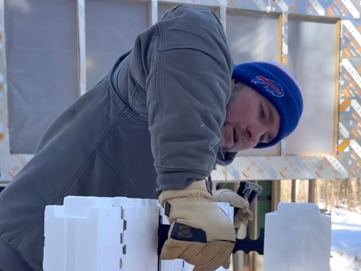 ช่างก่อสร้างอเมริกันใส่ไม้ค้ำยันปูนฉาบผนัง