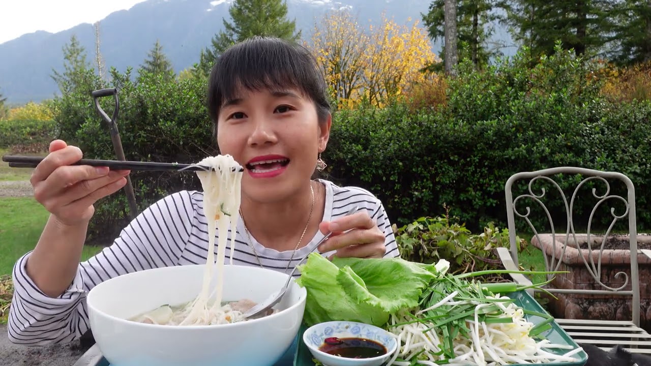 ĐÃI GIA ĐÌNH CHỊ CHỒNG ĂN BÚN THỊT NƯỚNG RAU SỐNG VƯỜN NHÀ