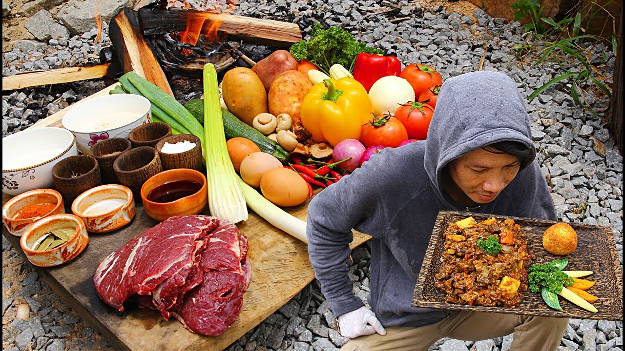 Survival Cooking Pork Head BBQ Recipe with Coconut Water - Cook Pig Head BBQ Eating So Yummy