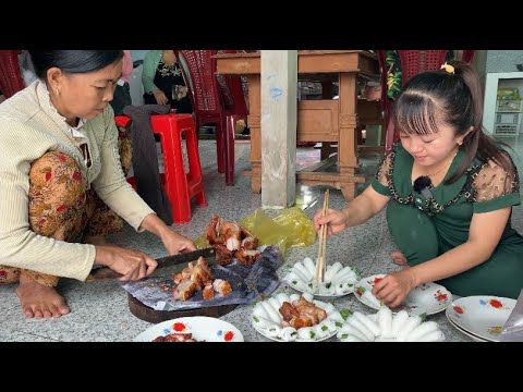 Út Ống Tre và gia đình gói bánh tét chuẩn bị đám giỗ miền tây