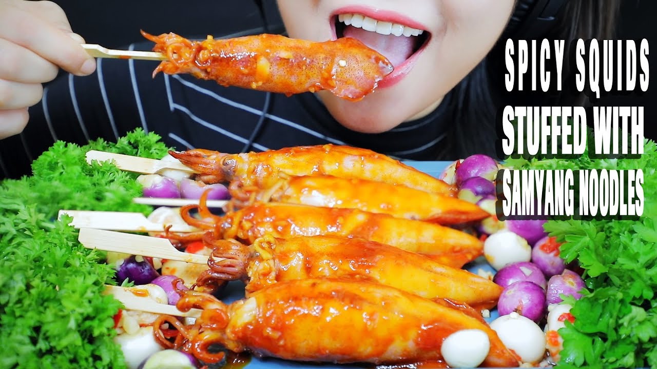 ASMR EATING SQUID STUFFED WITH ENOKI MUSHROOM AND CHEESE RICE CAKE EATING SOUNDS LINH ASMR