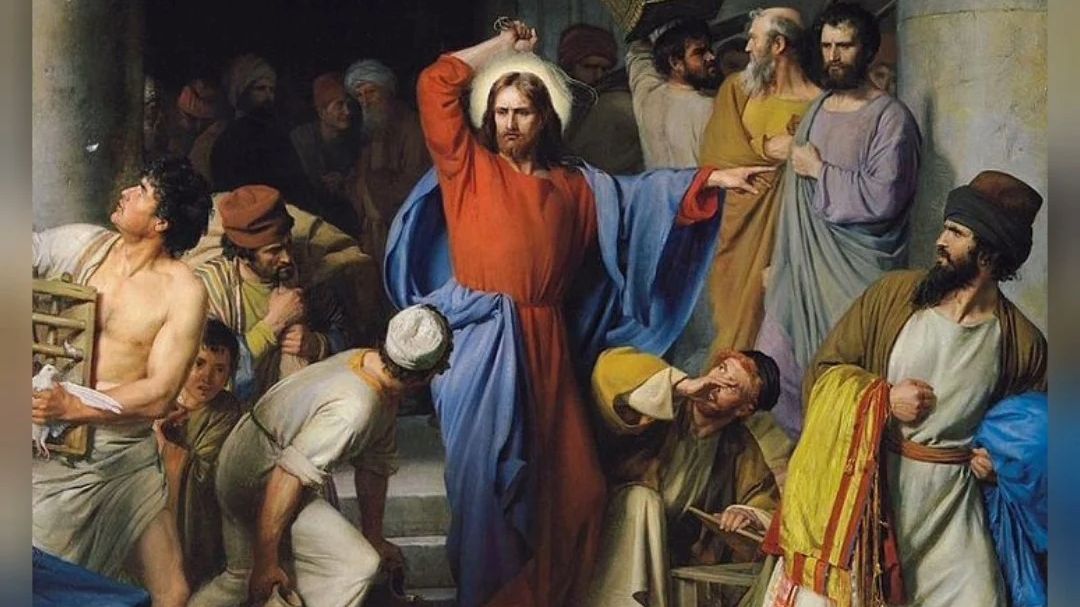 He made a whip out of cords and drove them all out of the temple area, with the sheep and oxen, and spilled the coins of the money-changers and overturned their tables, and to those who sold doves he said, "Take these out of here, and stop making my Father's house a marketplace."