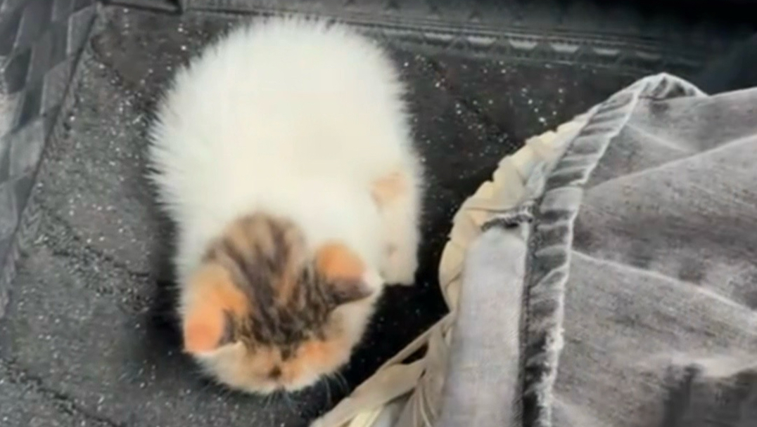 Con mèo tam thể đi lạc đẹp đến nỗi cô gái trẻ chú ý đến nó khi đi ngang qua sân nhà.