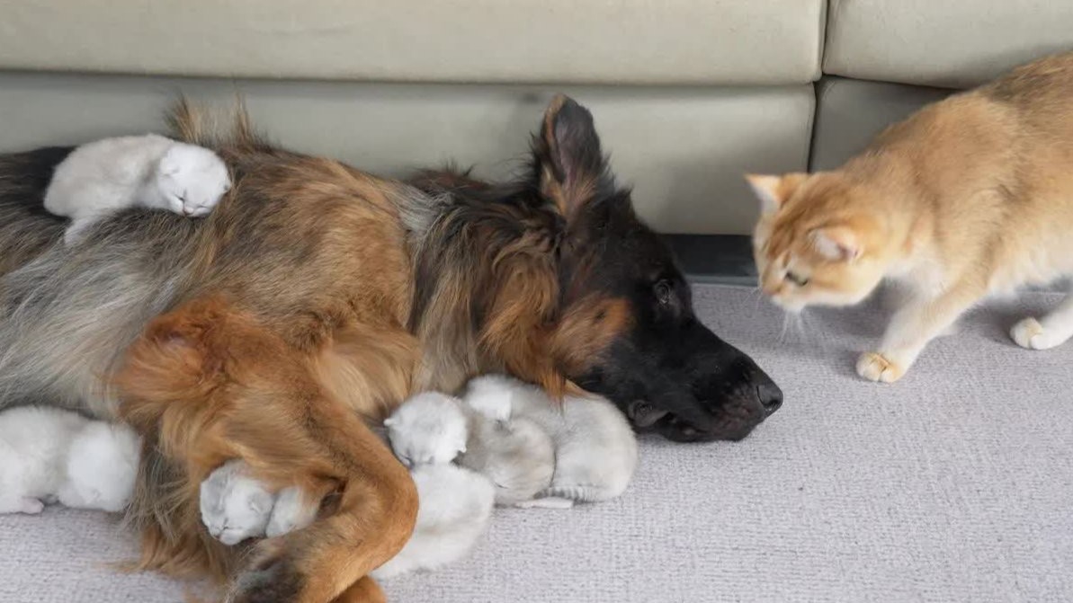 Phản ứng hài hước của người chăn cừu Đức với mèo con