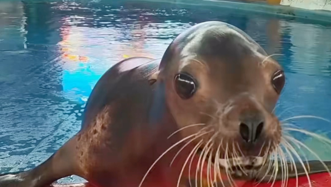 Một chú sư tử biển con bị vướng vào lưới đánh cá bất hợp pháp nặng và không thể di chuyển. [Đội Bảo