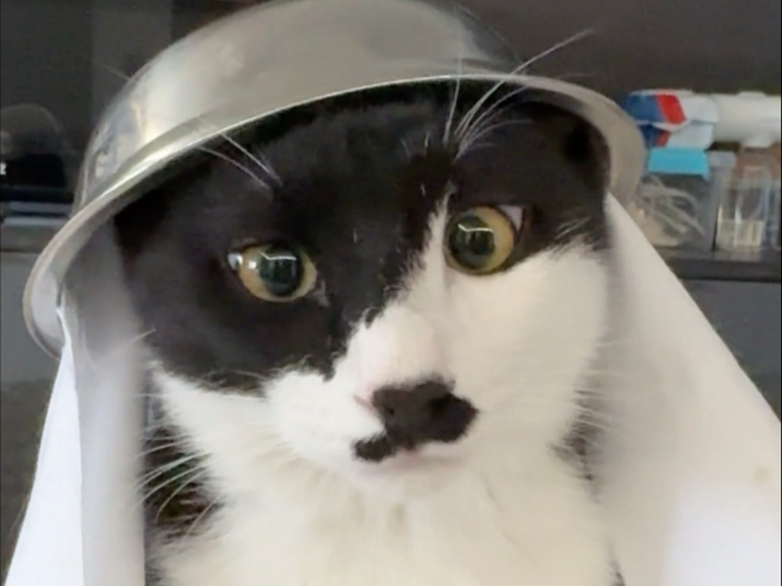 Khi bạn ăn xong mà quên tháo yếm dãi cho mèo