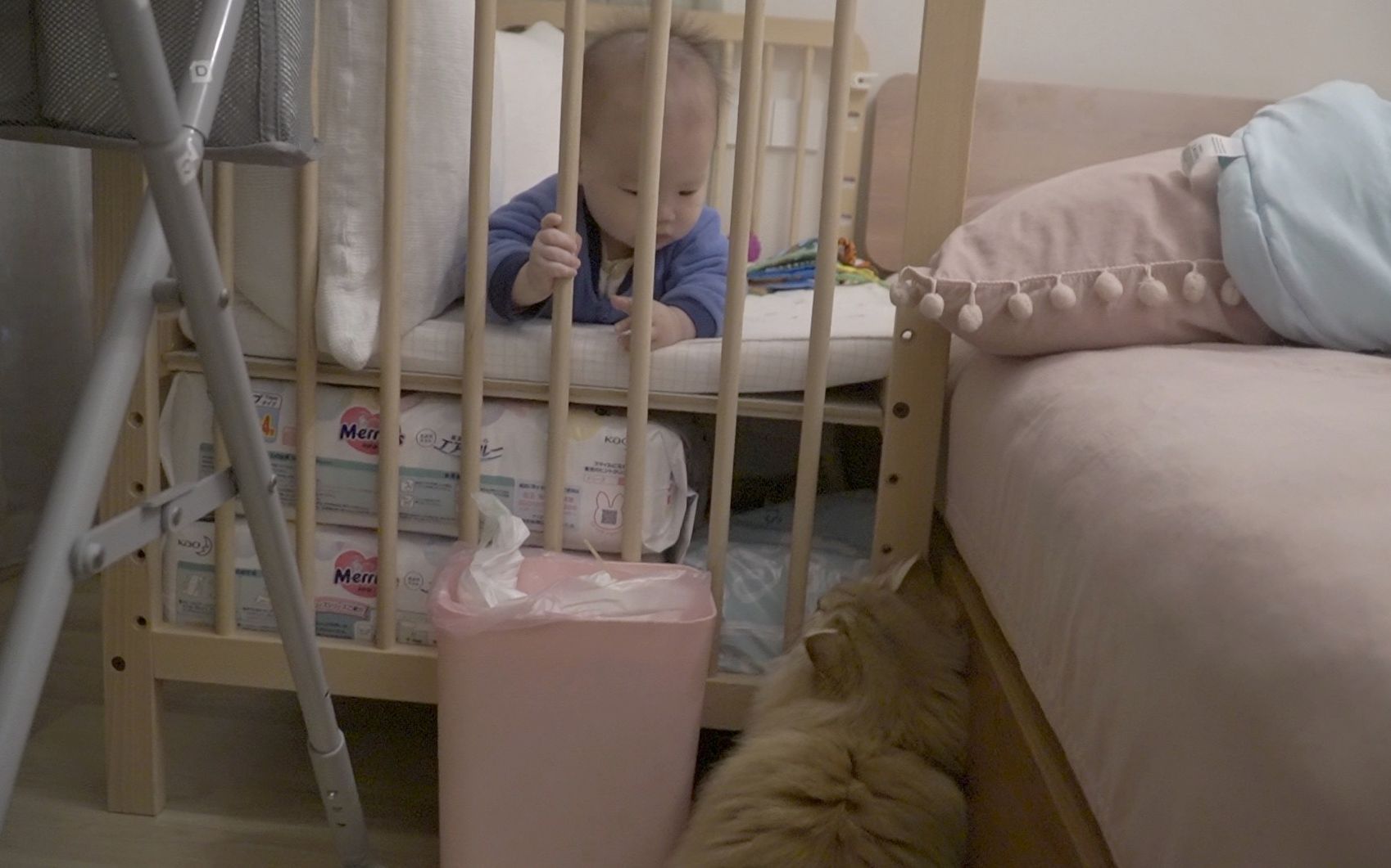 Chú mèo ở trên giường em bé mãi không chịu xuống