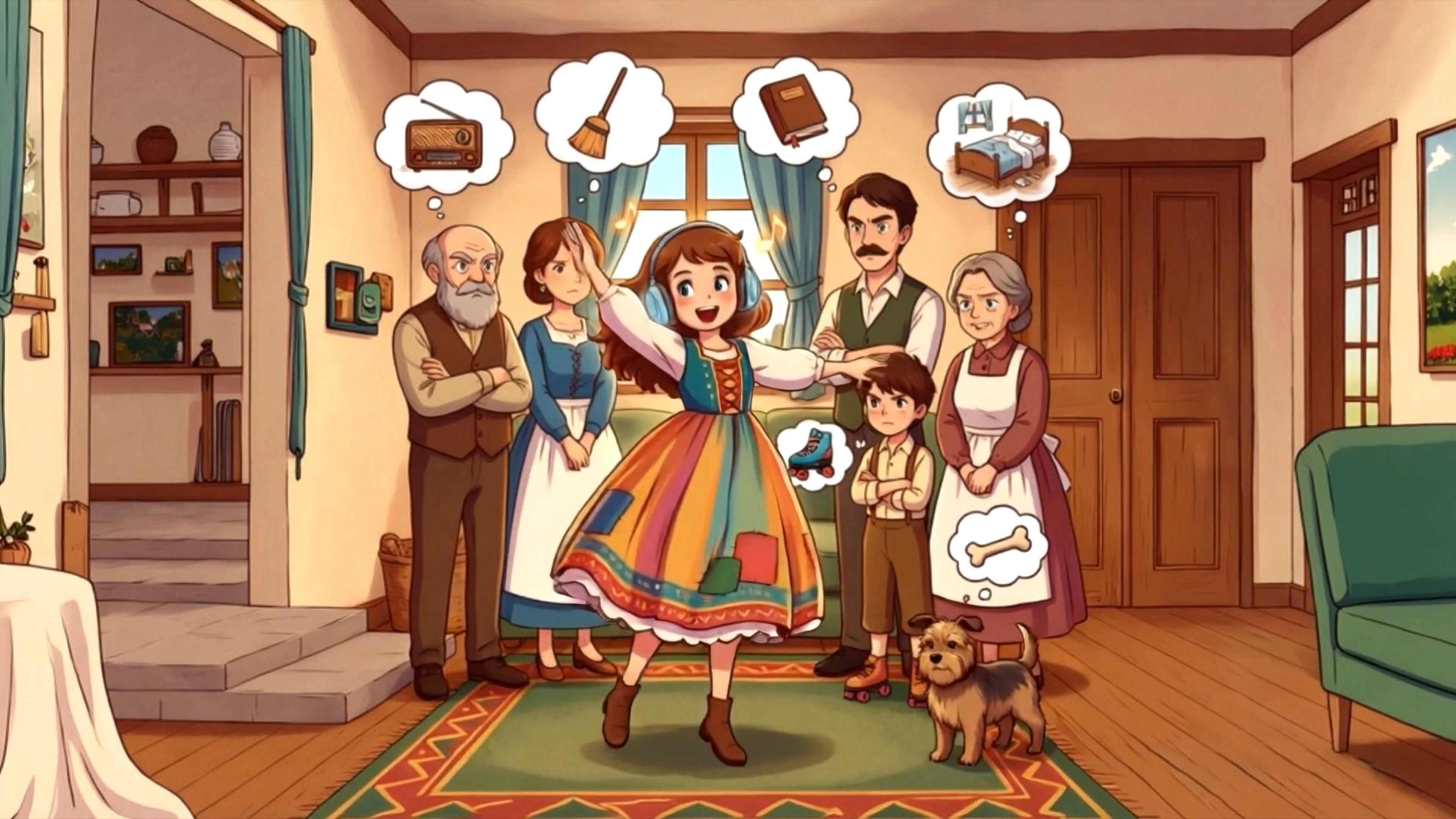 Even Grandma and Grandpa smiled broadly, feeling the sounds circling in the air and echoing down the hallway. The whole family forgot about their chores for a moment. Even the dog, sitting right in the middle of the dancing circle, happily tapped his paws to the beat!