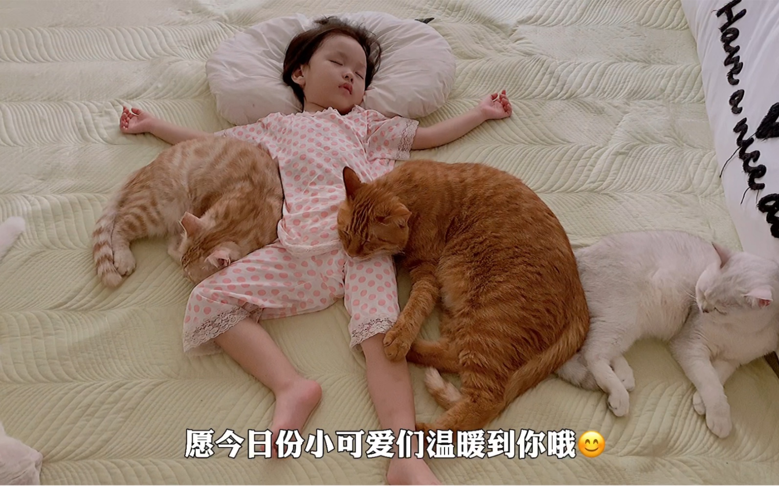 猫咪们陪着宝宝睡觉,这只大橘猫总想搂着小主人