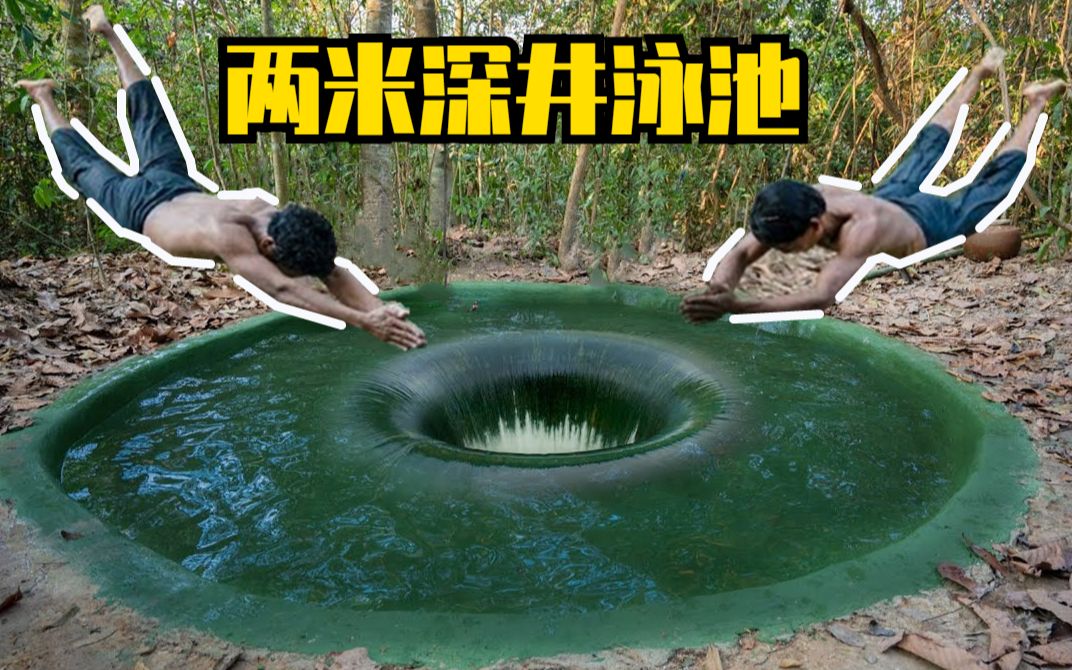 【原始建造】兄弟俩徒手挖2米深井泳池!跳水游泳两不误