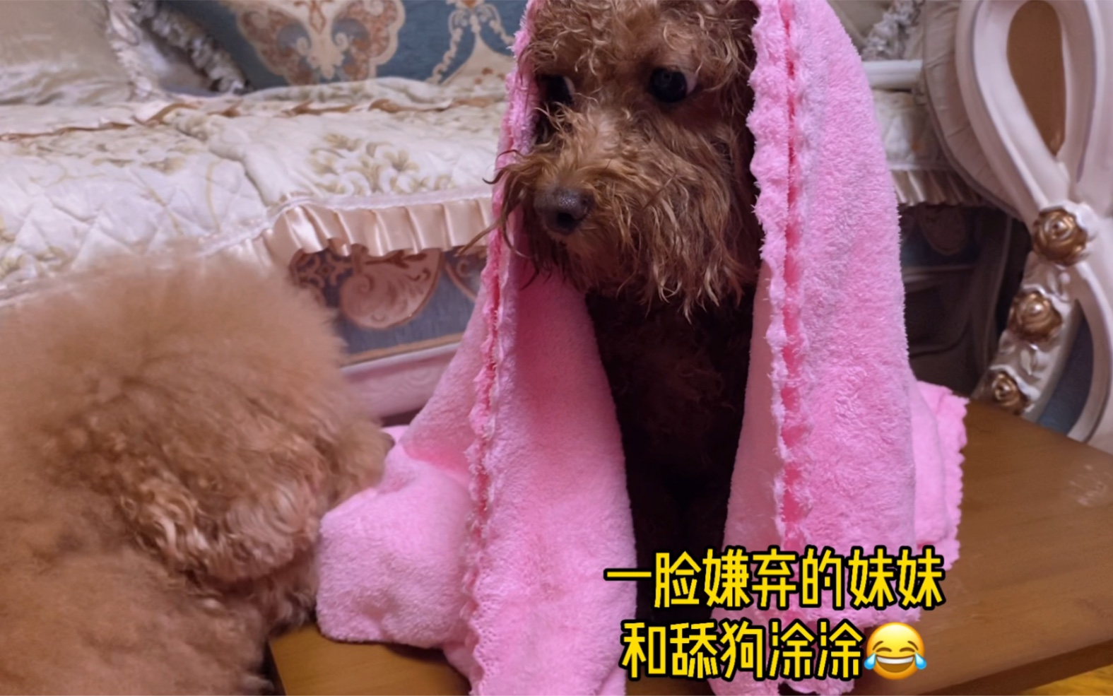给妹妹洗澡,老狗涂涂忙前忙后的伺候着