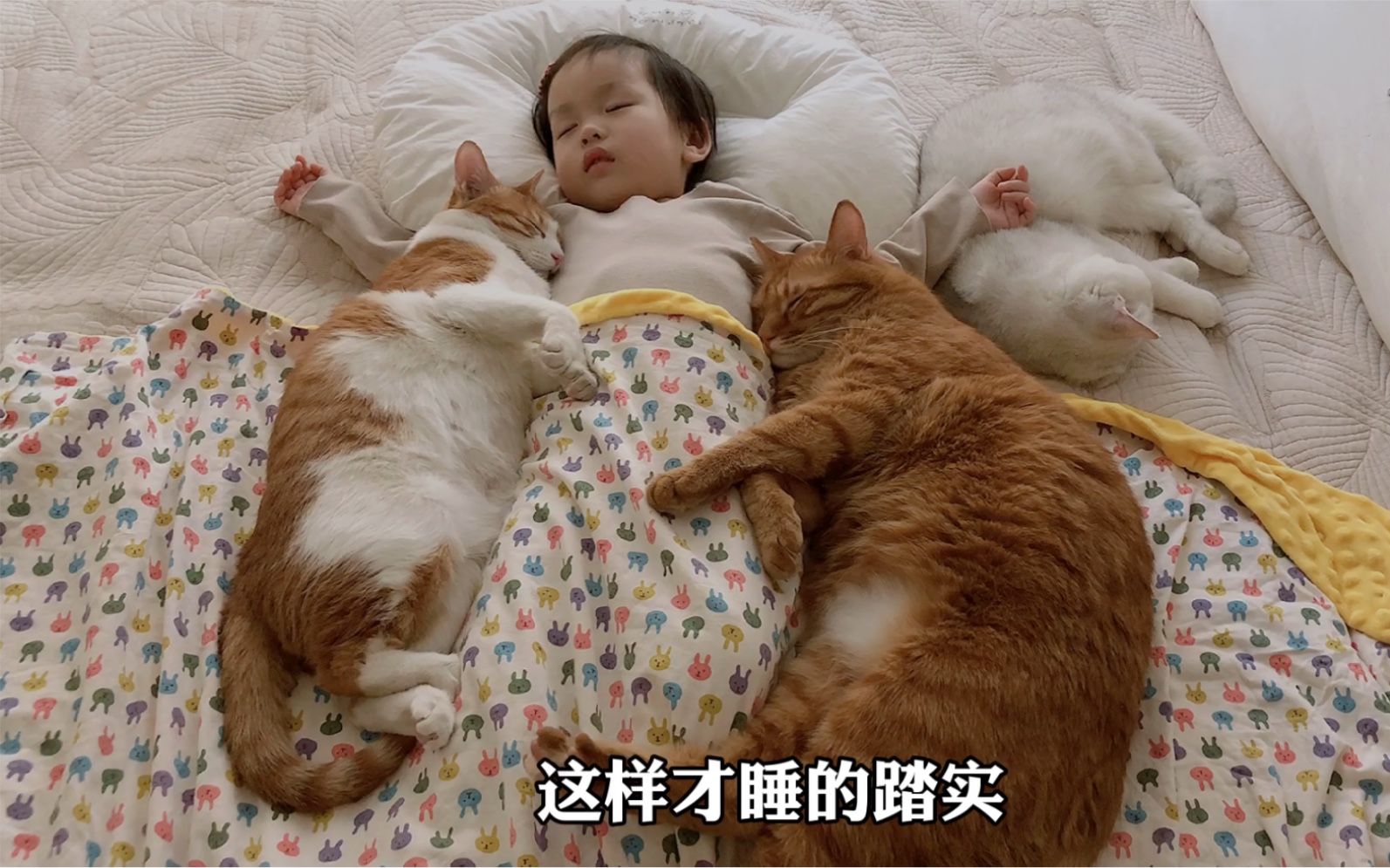 猫咪们陪着宝宝睡觉,这只大橘猫总想搂着小主人