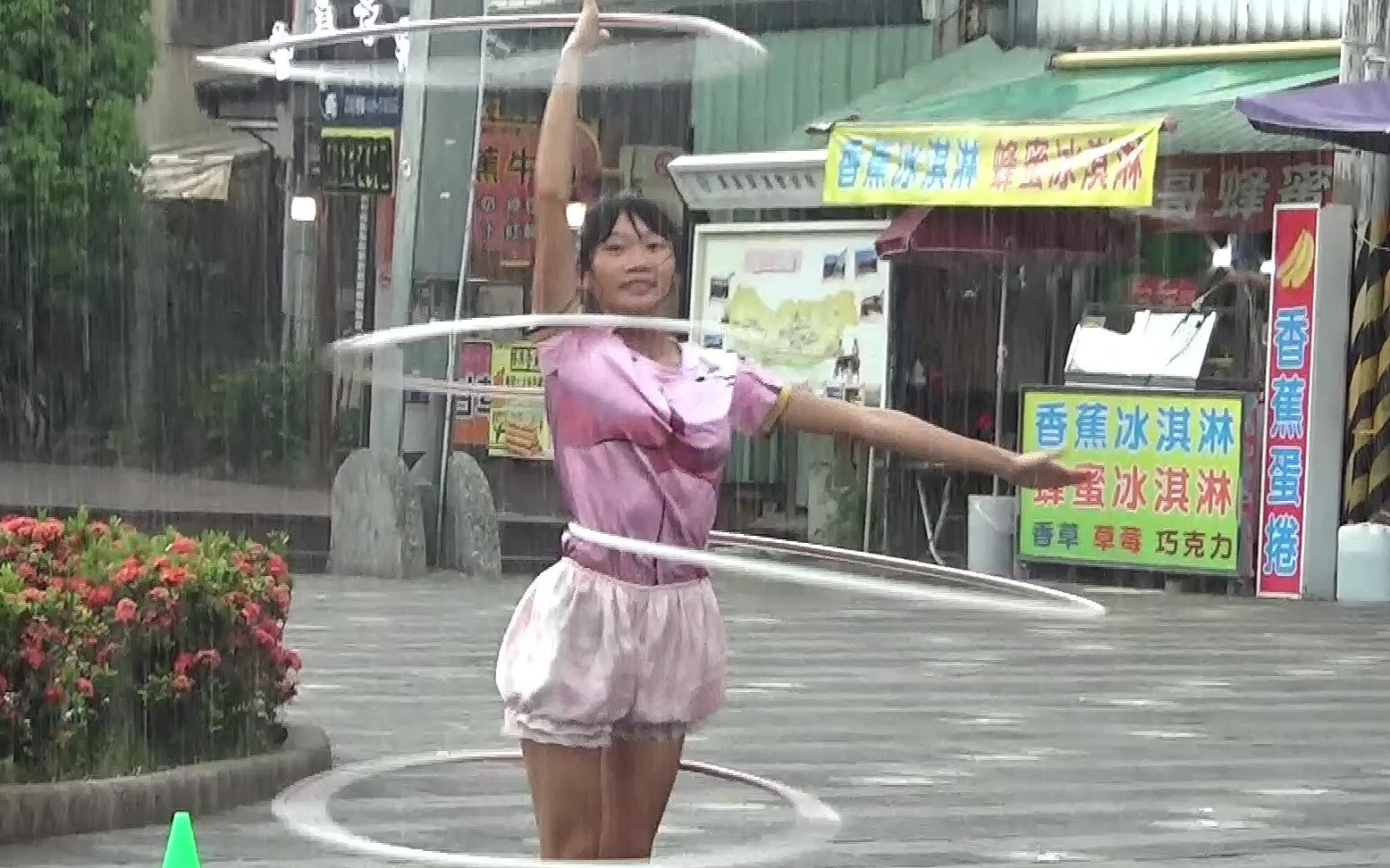 女孩在街头卖艺 生锈的呼啦圈 卖力的摇出下一餐