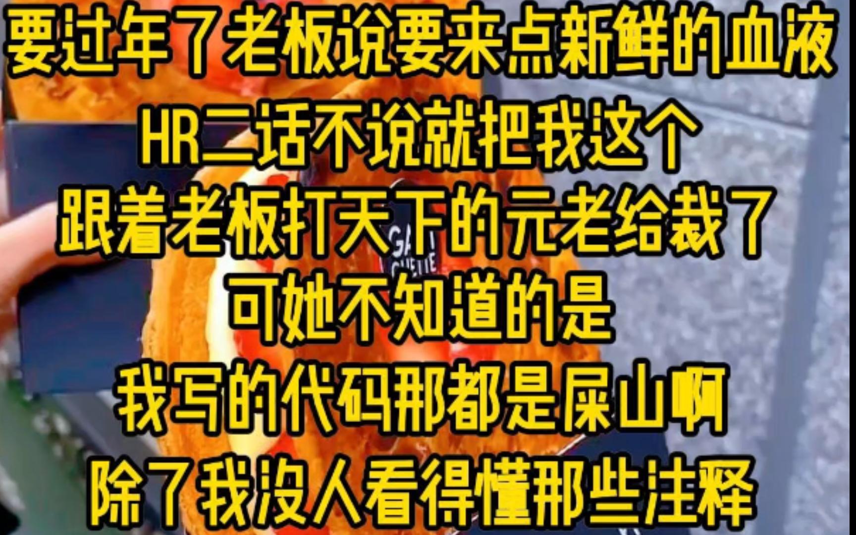 要过年了老板说要来点新鲜的血液,HR二话不说就把我这个跟着老板打天下的元老给裁了,可她不知道的是我写的代码都是屎山,除了我没人能看懂那些注释,结果...