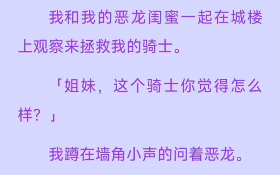 我和我的恶龙闺蜜一起在城楼 上观察来拯救我的骑士。 「姐妹,这个骑士你觉得怎么 样?」