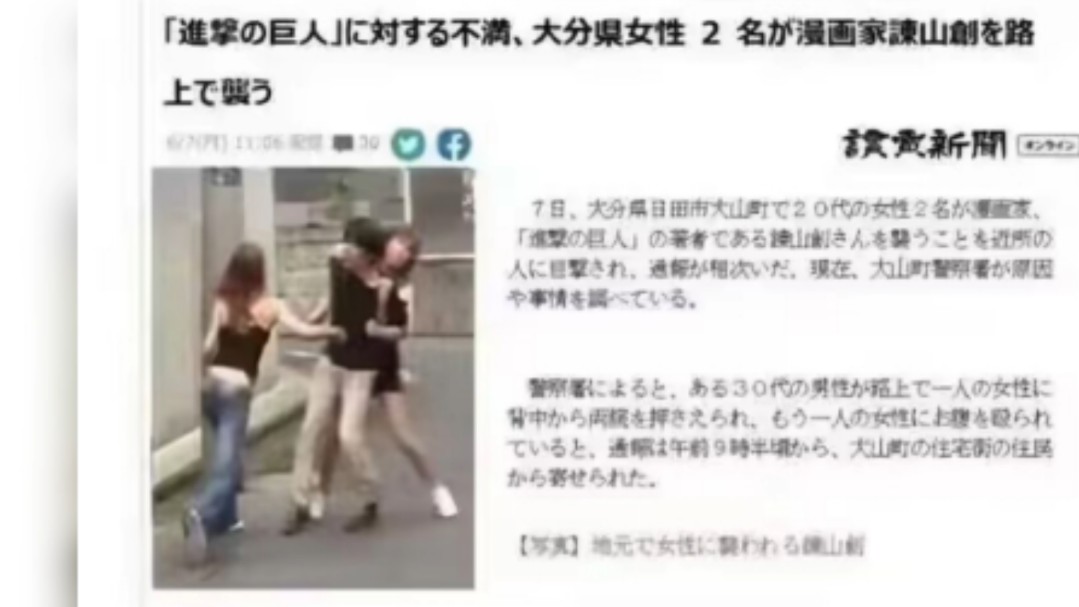 悲报!著名日本漫画《进击的巨人》作者谏山创,在大分县大山町遭遇两名女性袭击!