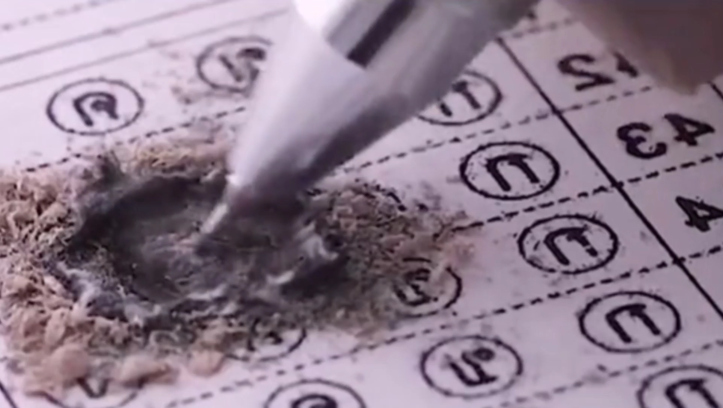 一女学生考试竟然把试卷和桌子涂出一个大洞