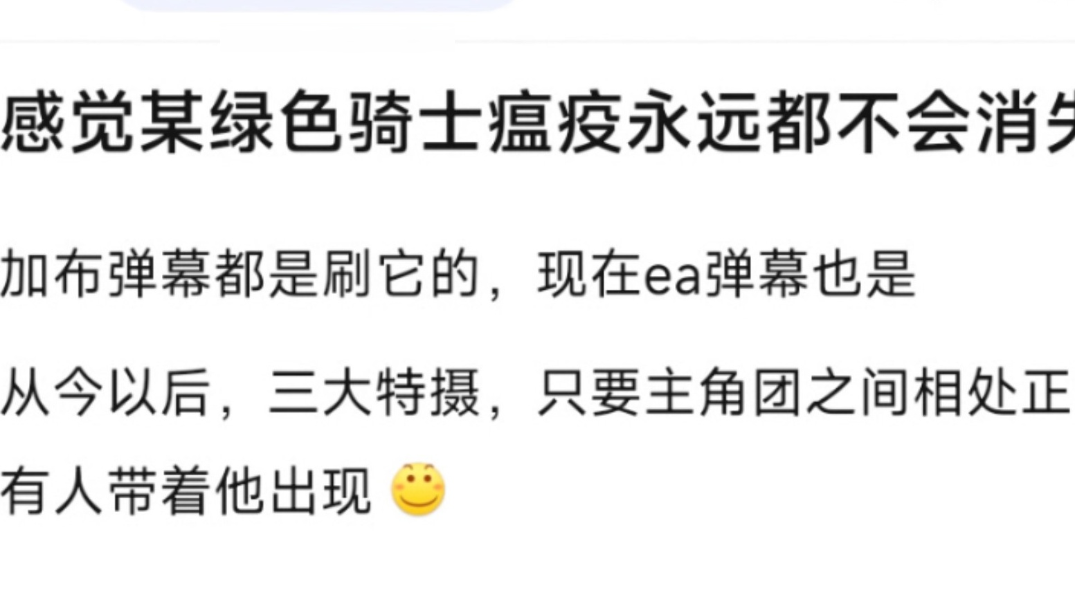 感觉某绿色骑士瘟疫永远都不会消失了,加布弹幕都是刷它的,现在ea弹幕也是,从今以后,三大特摄,只要主角团之间相处正常就会有人带着他出现