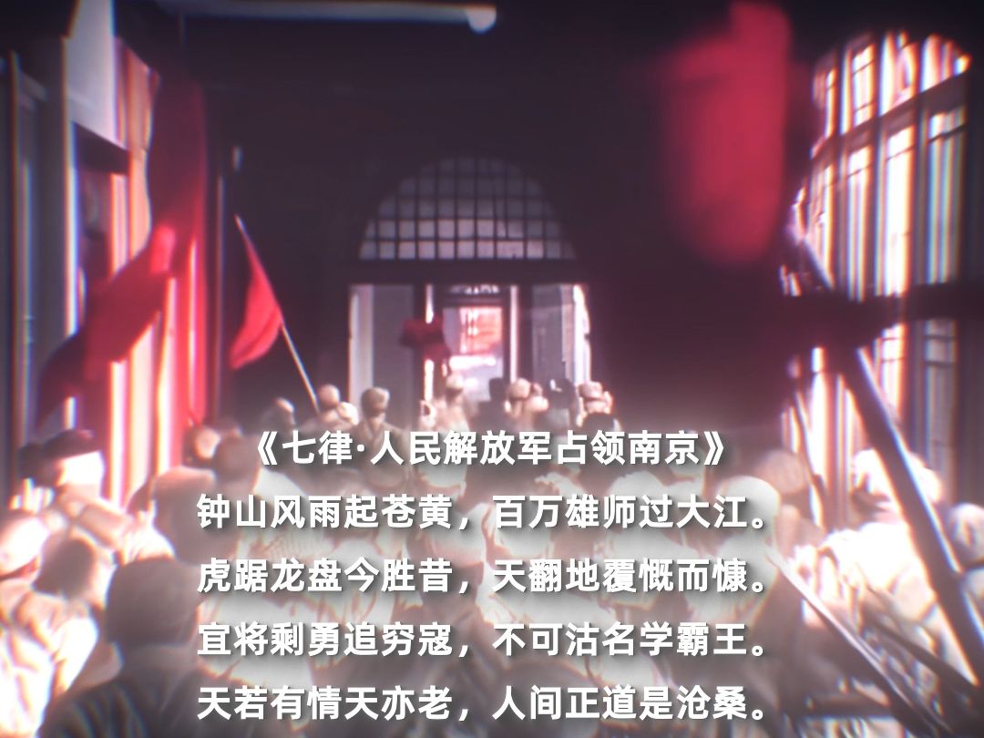 钟山风雨起苍黄,百万雄师过大江。 虎踞龙盘今胜昔,天翻地覆慨而慷。 宜将剩勇追穷寇,不可沽名学霸王。 天若有情天亦老,人间正道是沧桑。