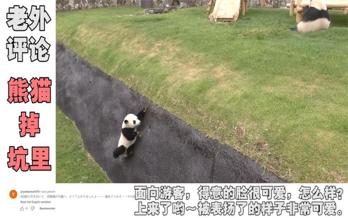 国宝“掉坑里”了,腿短又近视,爬上去后得意的样子萌化老外!