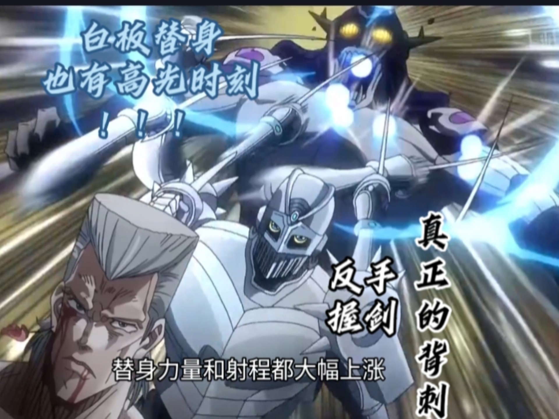老板还是吃了出场太晚的亏,三体人没见过原始人,初次见面试探了半天,没有试出银色战车的能力,怎么也想不到对面的替身能力只是召唤一个手拿能发射剑身的西洋剑的人形打手