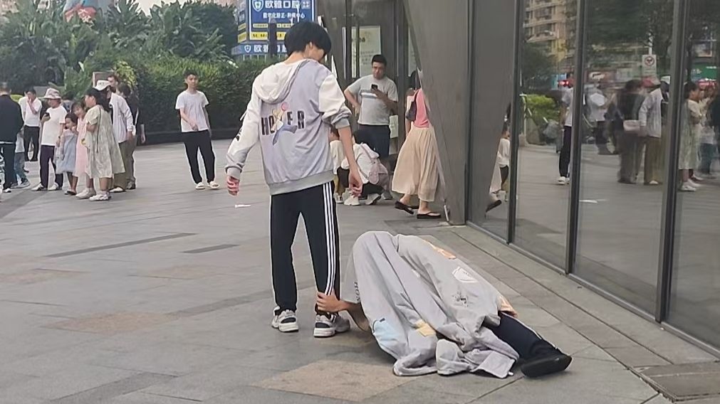 女孩在街头卖艺 生锈的呼啦圈 卖力的摇出下一餐