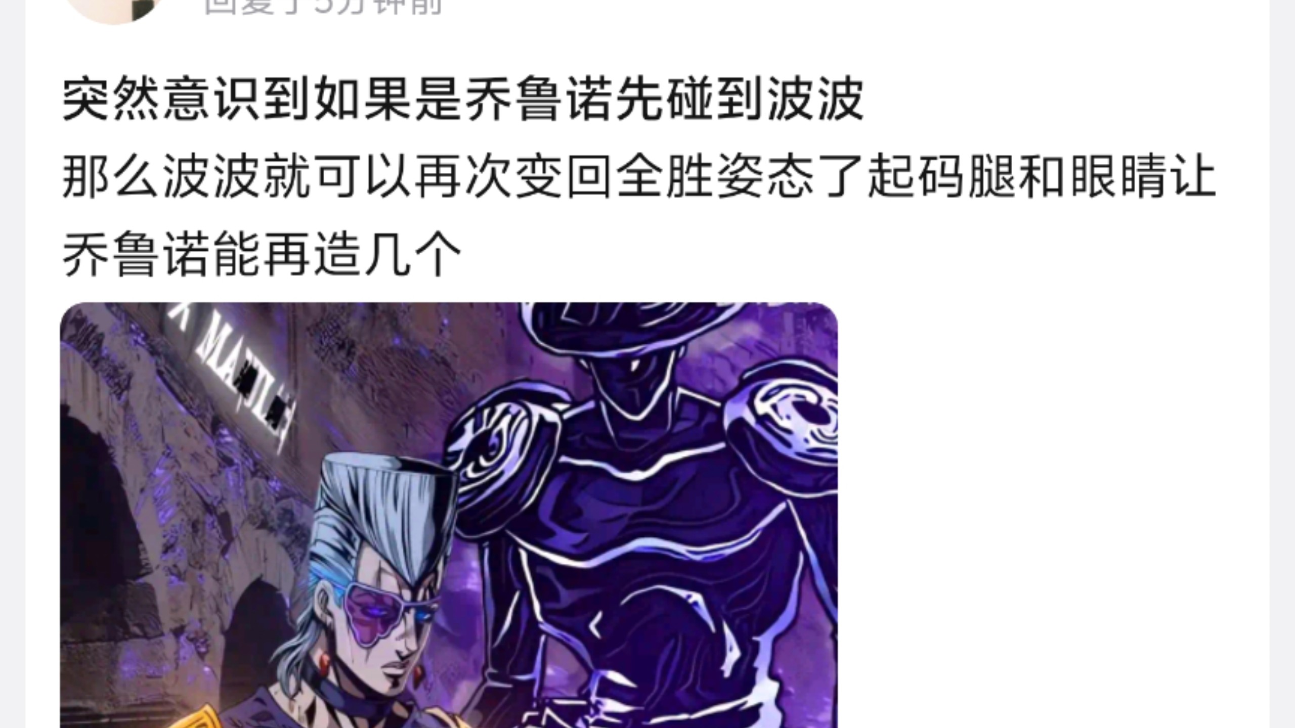 突然意识到如果是乔鲁诺先碰到波波,那么波波就可以再次变回全胜姿态了起码腿和眼睛让乔鲁诺能再造几个