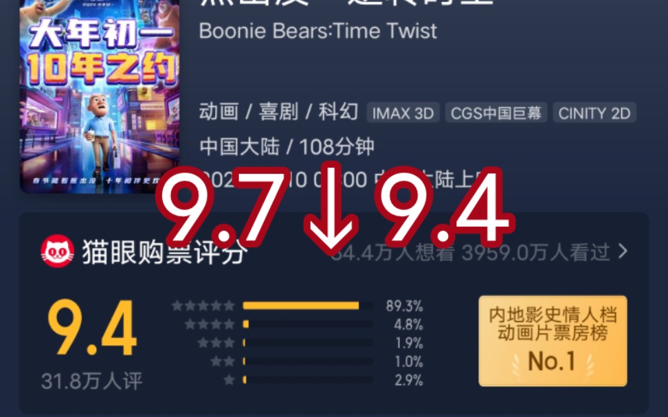 真神!《熊出没·逆转时空》猫眼开分9.7!中国影史评分并列第二,中国动画电影第一名