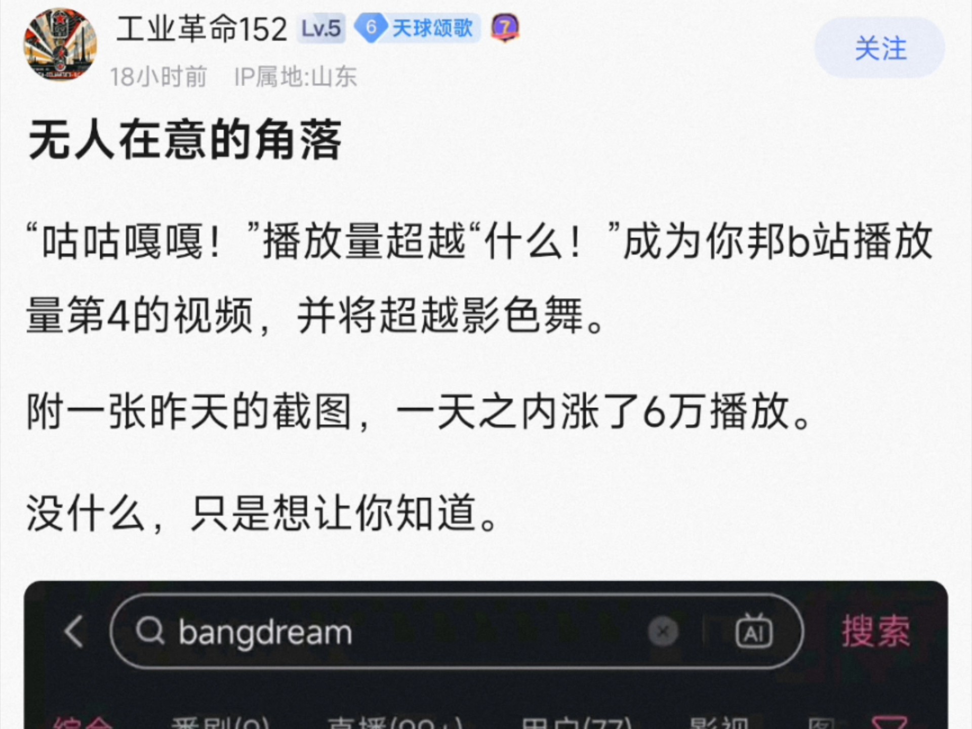 “咕咕嘎嘎!”播放量超越“什么!”成为你邦b站播放量第4的视频,并将超越影色舞。附一张昨天的截图,一天之内涨了6万播放。没什么,只是想让你知道。