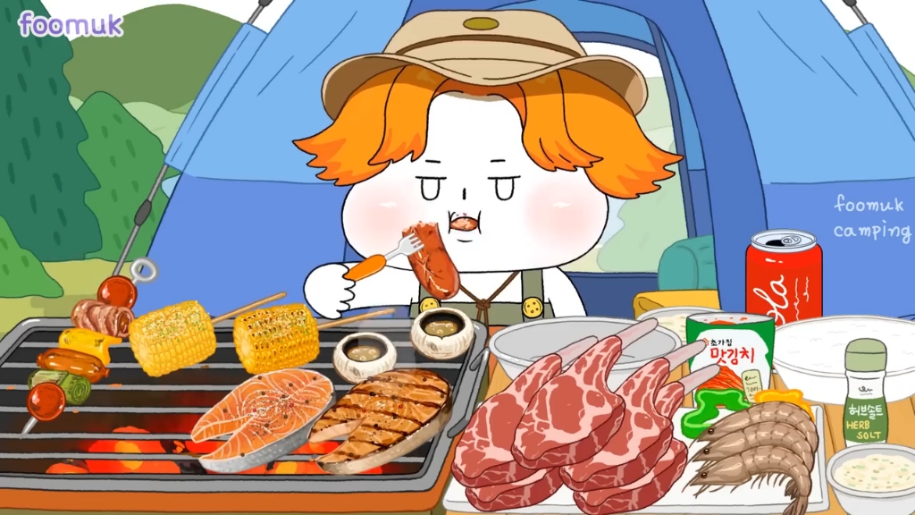 【foomuk动画】露营吃播!烤三文鱼、烤虾、烤羊肉