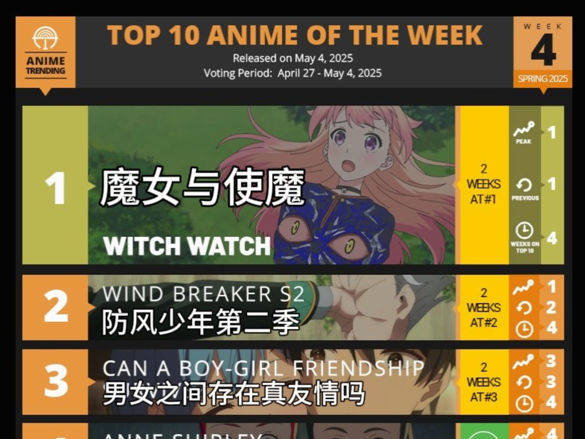 【排行榜】四月新番第4周热度排行榜前十名,anime corner/anime trending2025年四月新番