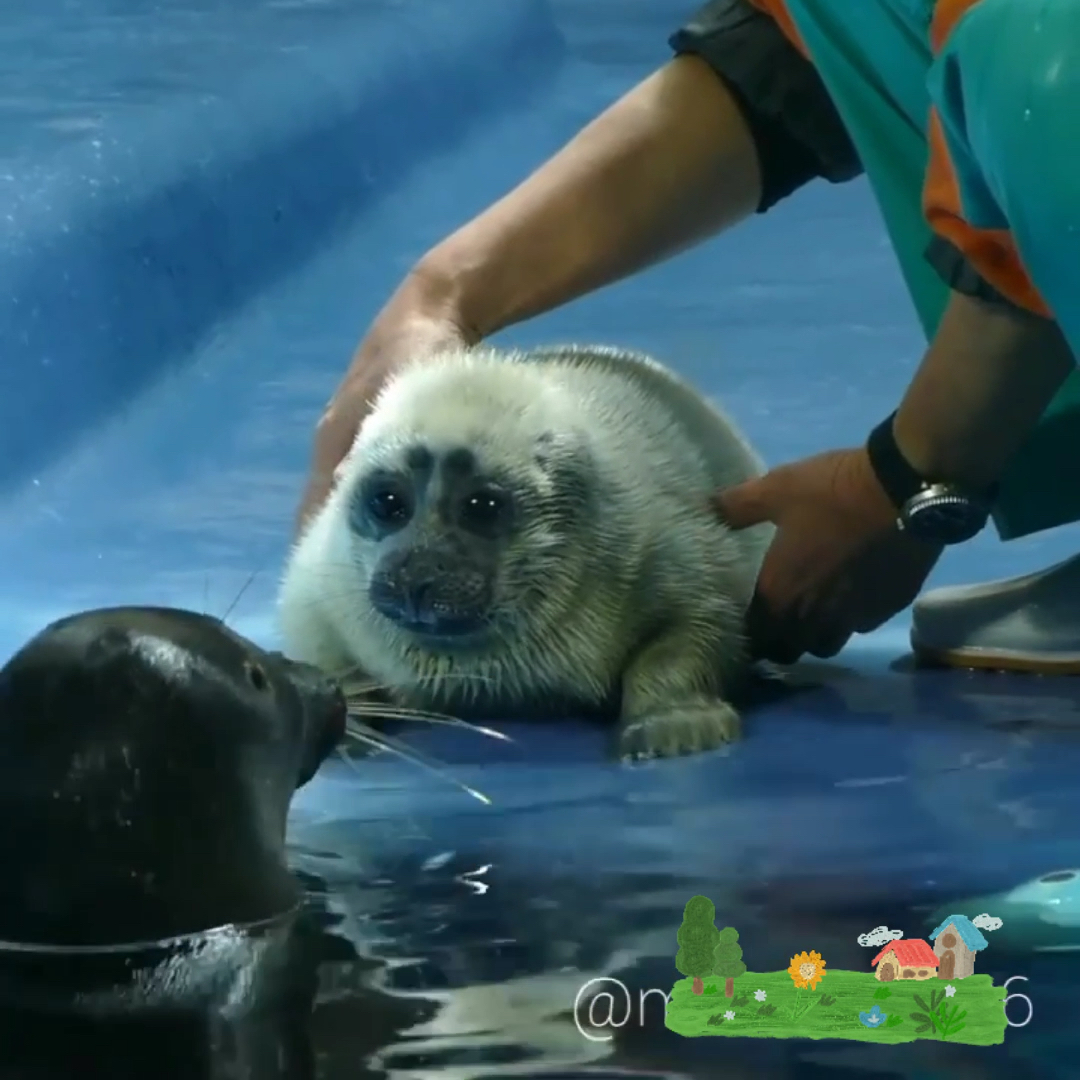 小海豹第一次见它爹很害怕想逃跑哈哈哈
