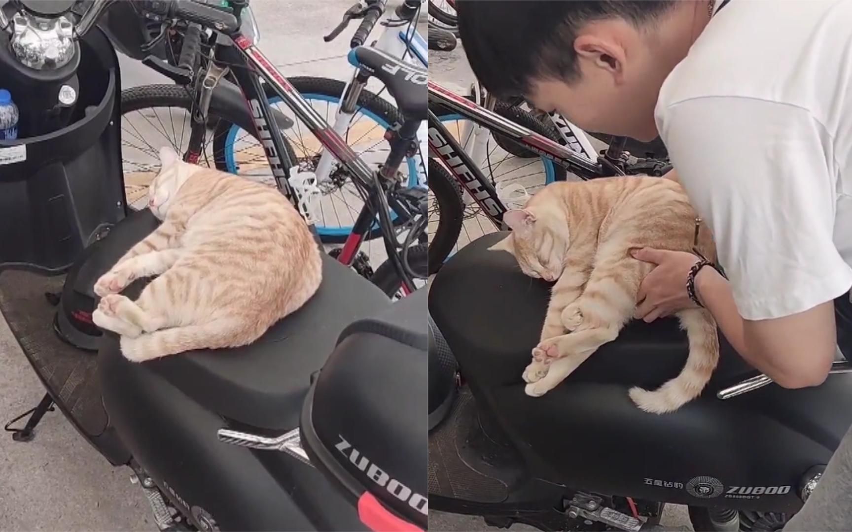 男生骑车看到座椅上睡了只猫,开口就叫宝贝,随后举动网友沦陷了