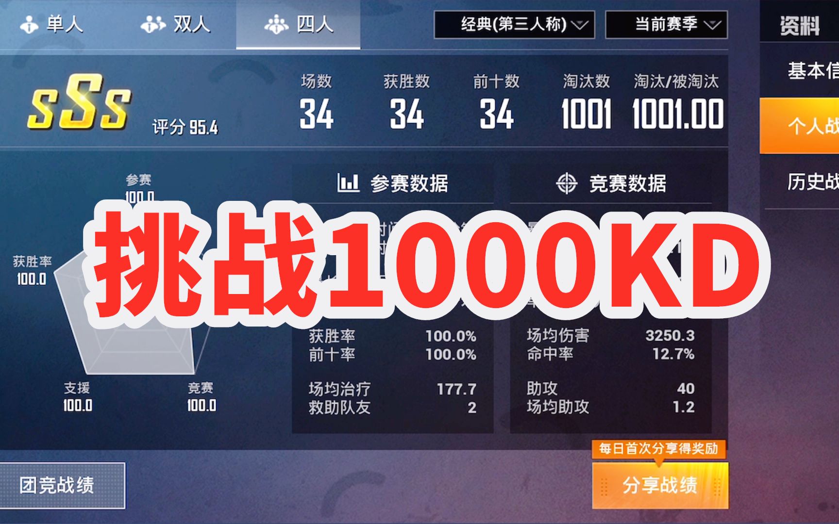 1000KD挑战成功?场均30杀!43场百分百吃鸡率!
