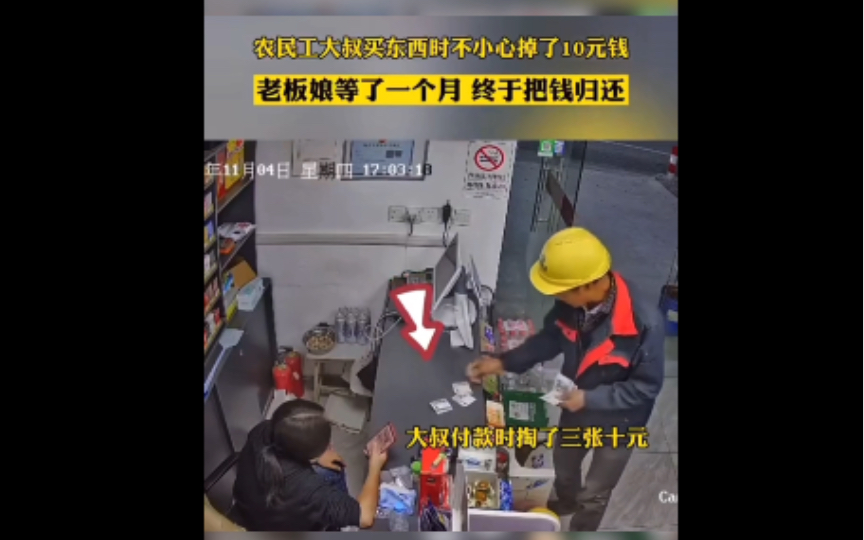 农民工大叔买东西时不小心掉了10元钱,老板娘等了一个月,终于把钱归还。