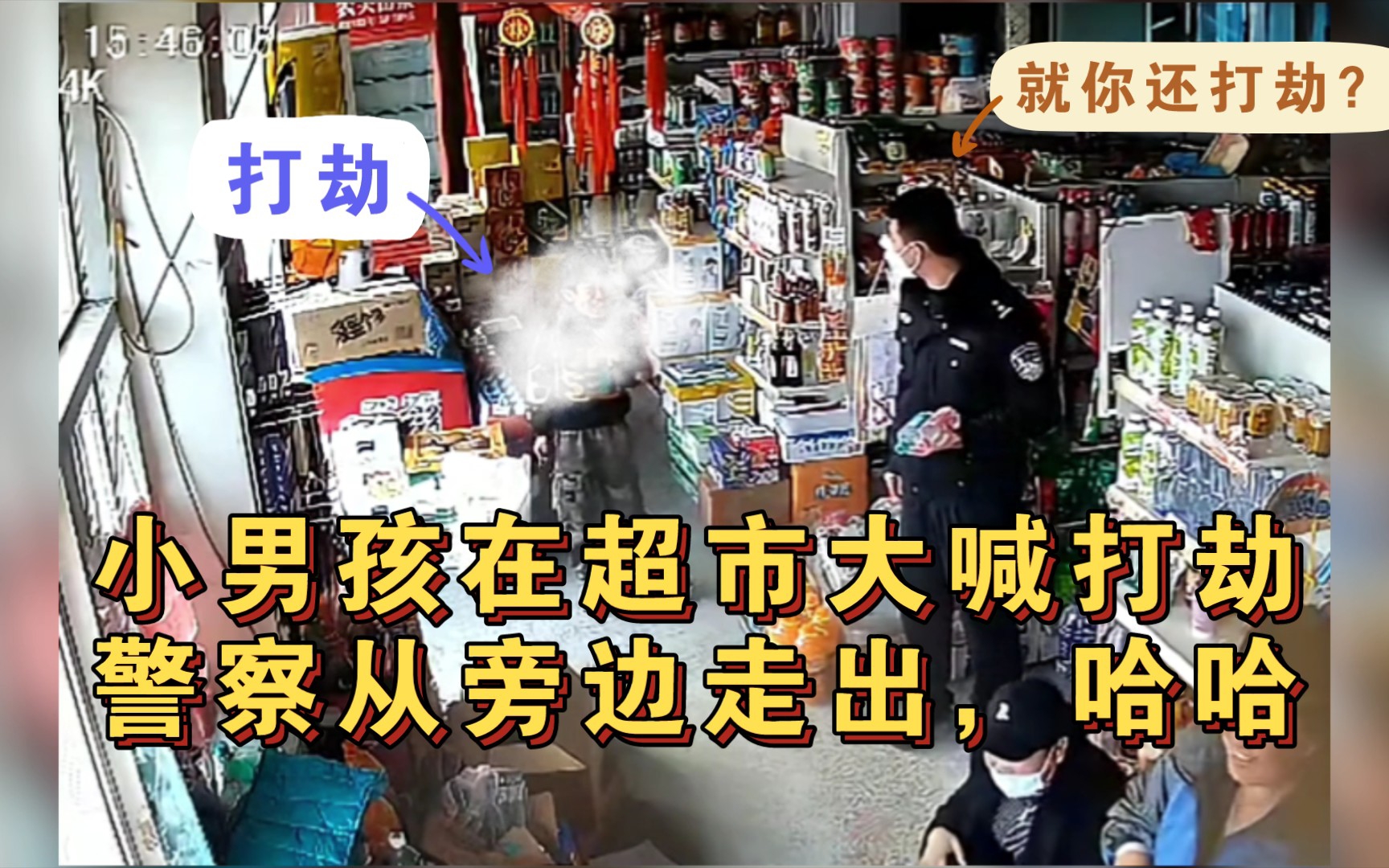 小朋友在自家超市打劫,不料警察走了出来,好尴尬啊,快跑。网友:最快出警,哈哈,笑死了。