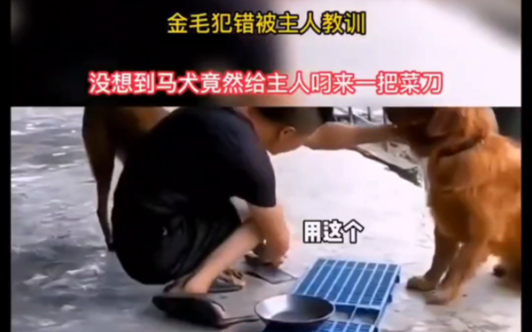 金毛犯错被主人教训,没想到旁边的马犬看热闹不嫌事大,竟然给主人叼来了一把菜刀