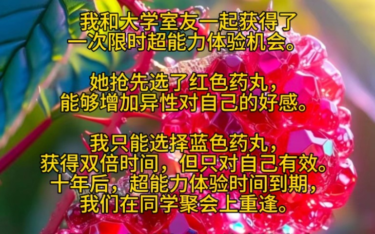 我和大学室友一起获得了一次限时超能力体验机会。 她抢先选了红色药丸,能够增加异性对自己的好感。我只能选择蓝色药丸,获得双倍时间……