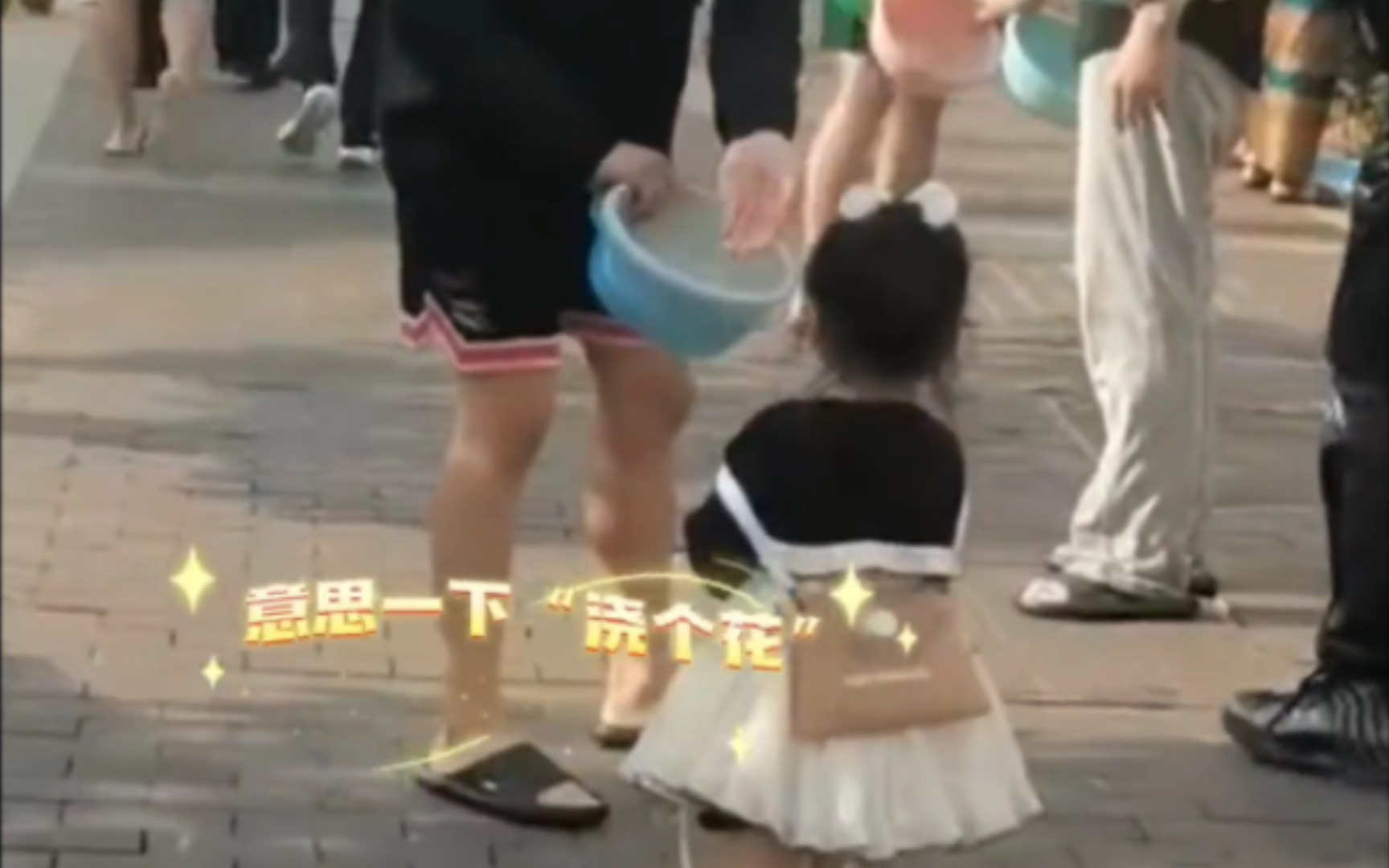 泼水节小小女孩追着一群男生呲水,男生转身回泼好像在浇花