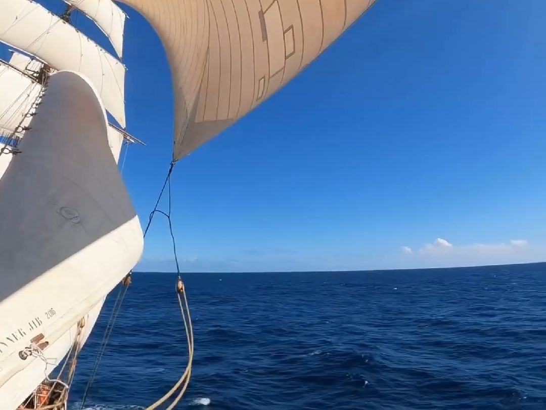 第一视角乘坐三桅帆船在大洋中航行
