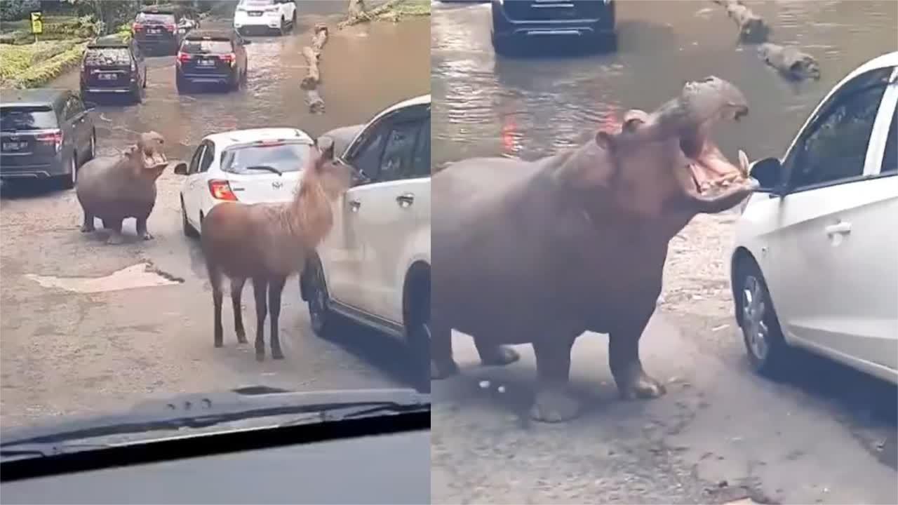 河马见小鹿吃着游客给的食物,立马模仿张开大嘴求投喂:我不挑食